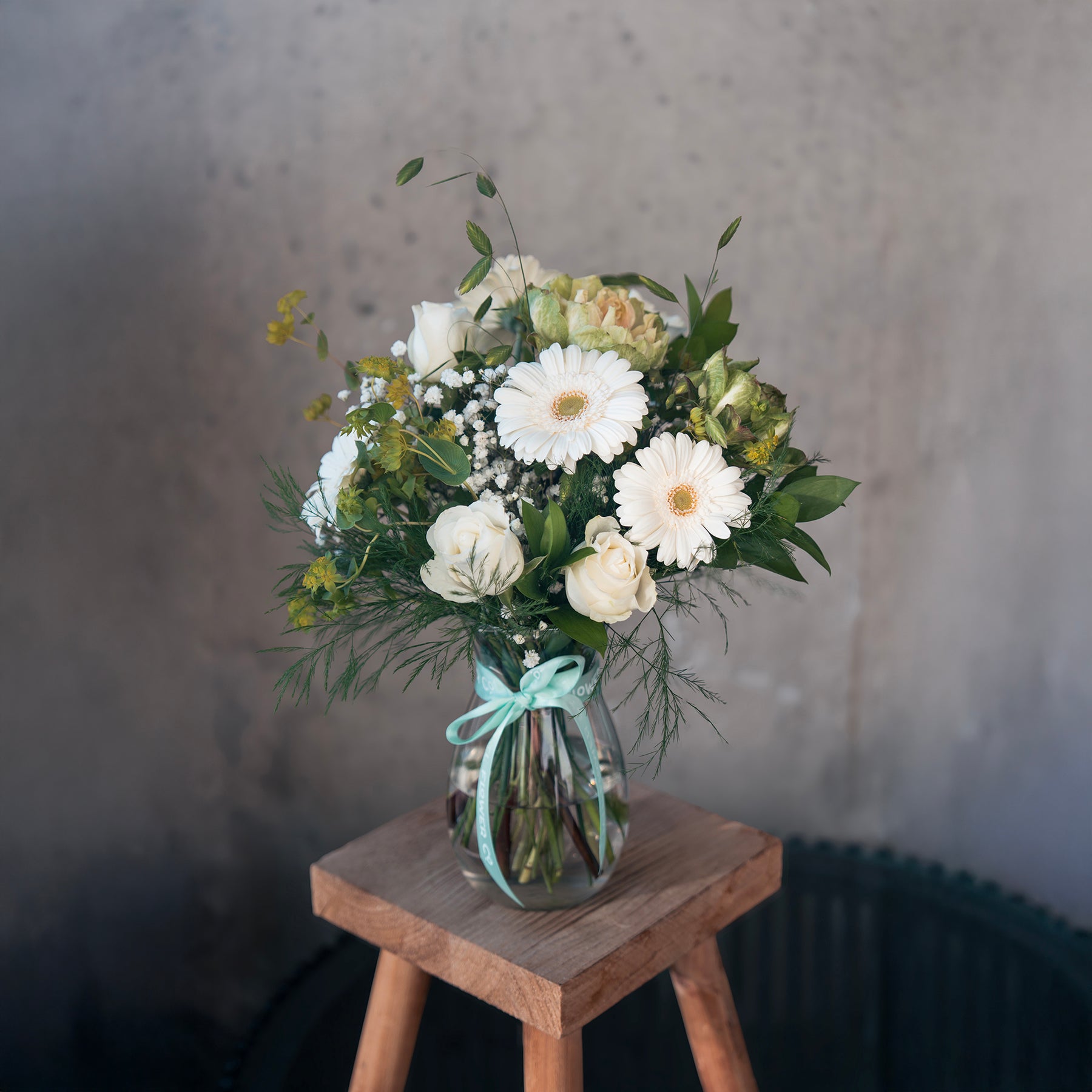 Un mélange apaisant de blancs et de verts, The Eterna incarne la beauté naturelle et la sophistication discrète. Cet arrangement luxuriant met en vedette des roses de jardin, du bupleurum, des lys gerbera blancs, du dianthus vert, du gypsophile, des roses de jardin veggie, de l’avoine de rivière et du ruscus israélien. Conçu pour évoquer le calme et la grâce intemporelle, il est parfait pour les moments de réflexion, de célébration ou simplement pour ajouter une touche d’élégance au quotidien.