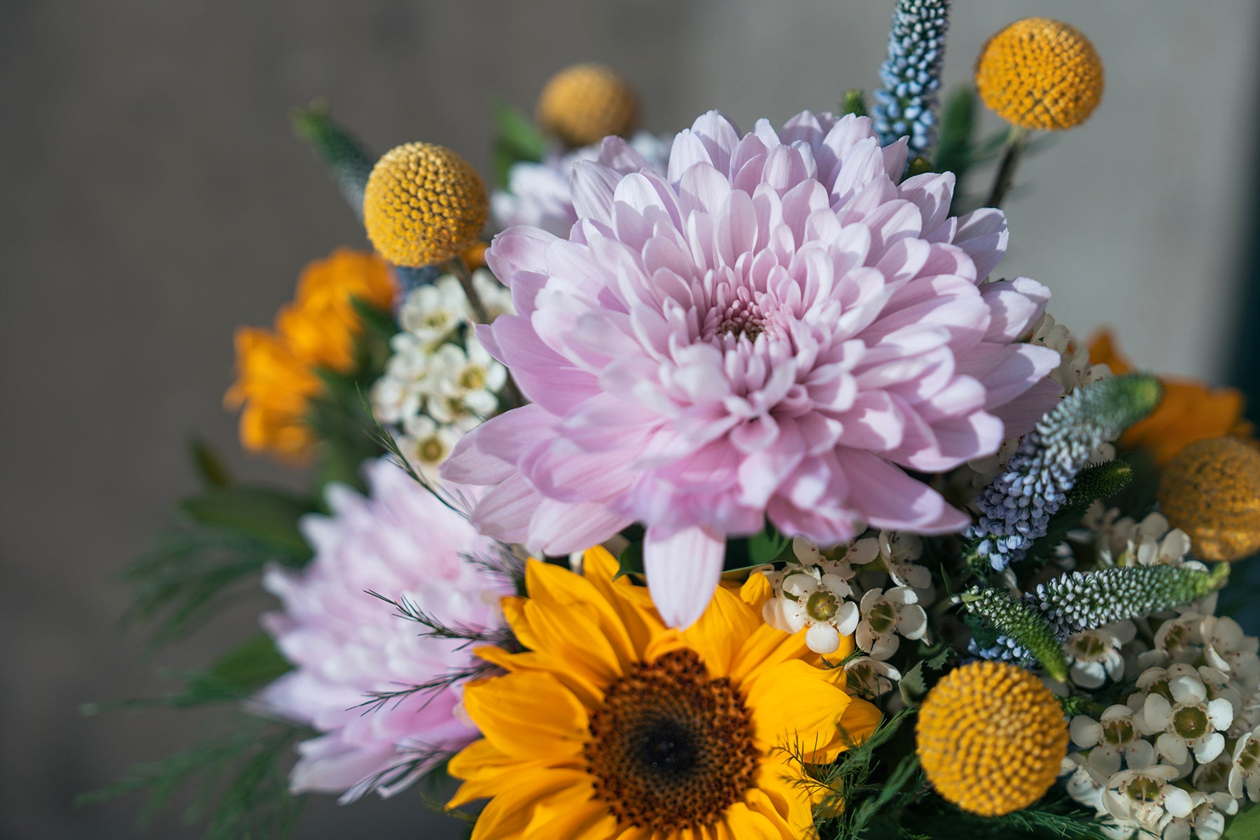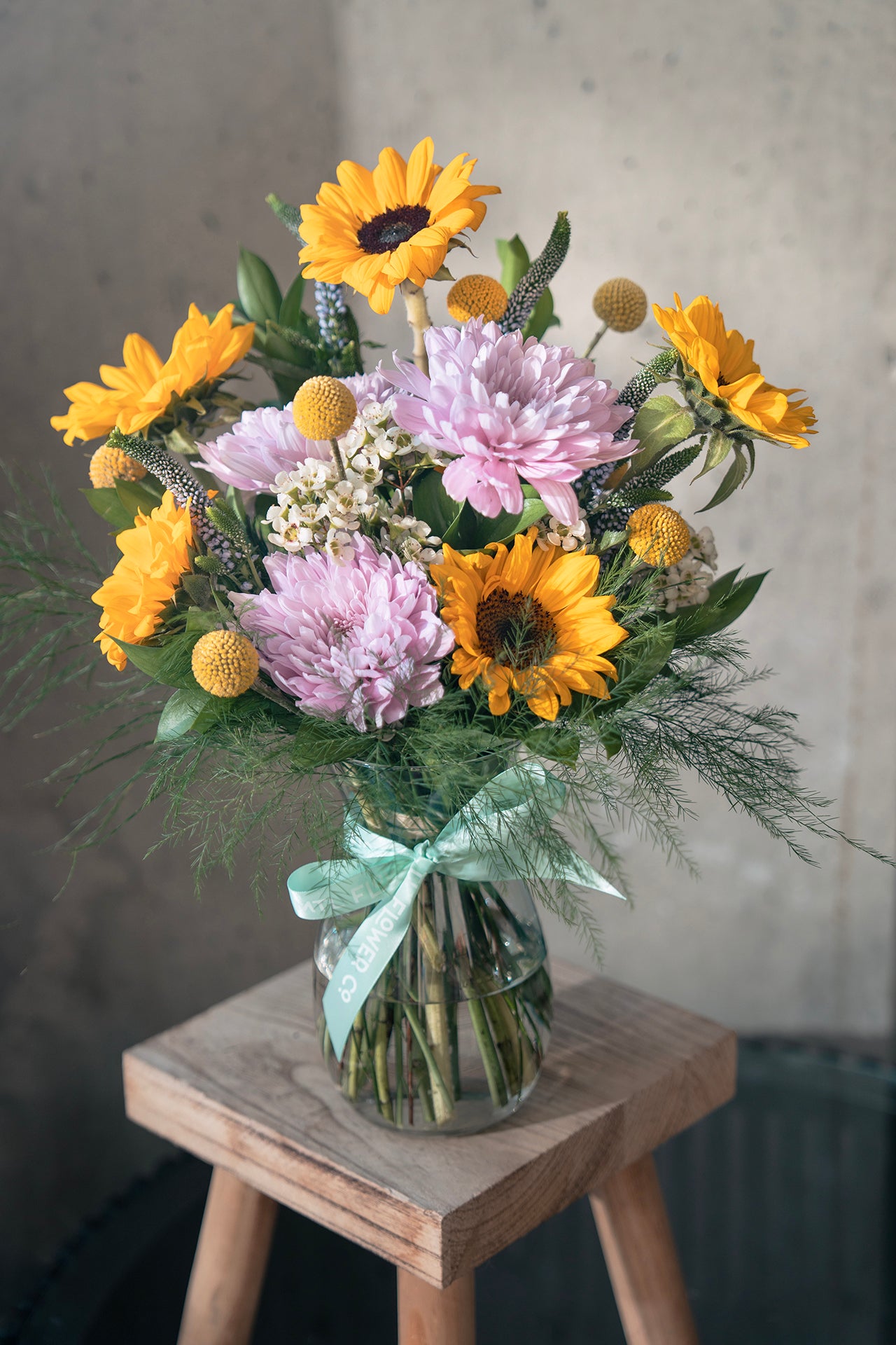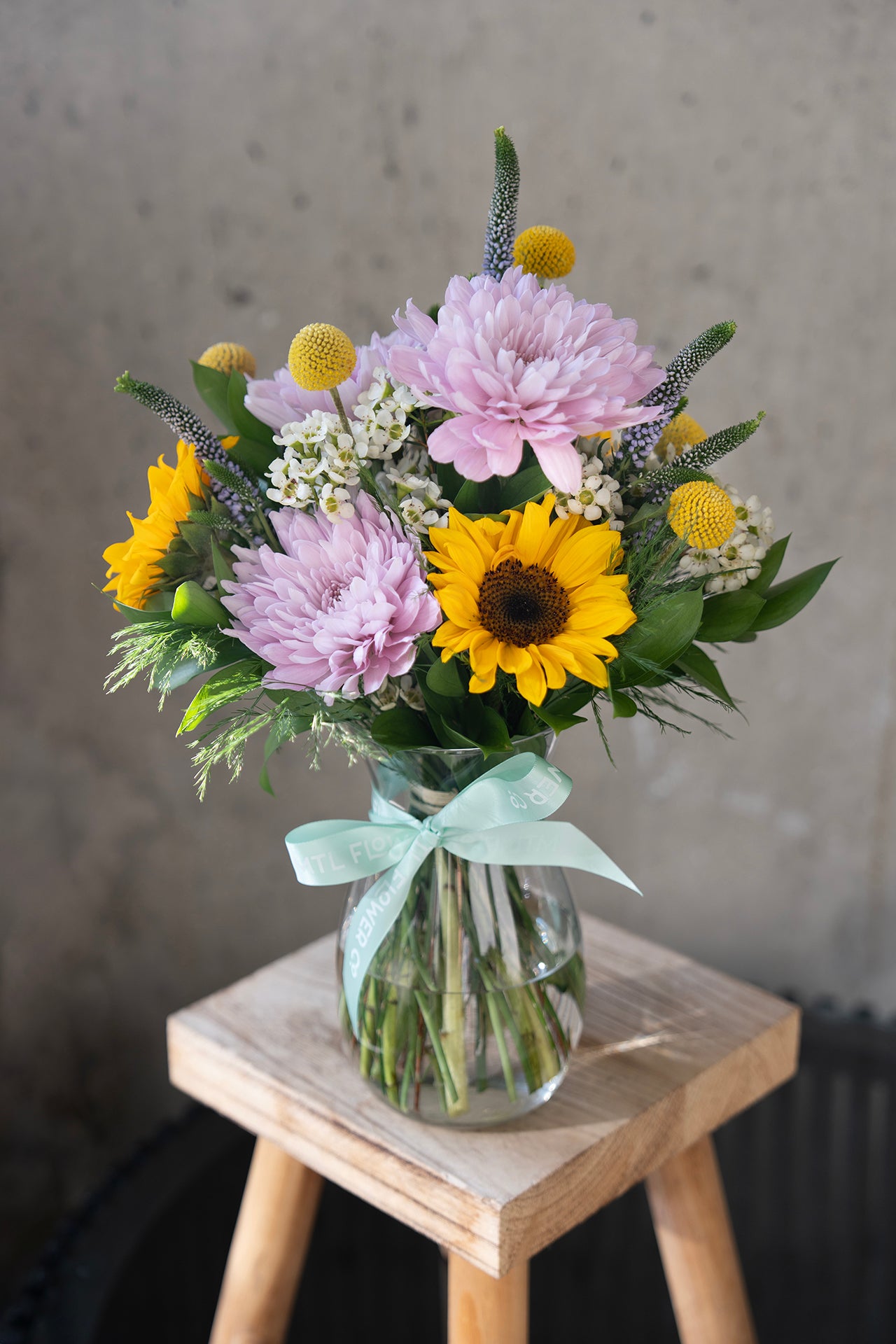 Rayonnant, enjoué et plein de chaleur — The Solange marie douceur et luminosité dans un bouquet parfaitement équilibré. Composé de mini tournesols, de craspedia, de fleurs de cire, de veronica lilas, de chrysanthèmes roses, de fougère tiki et de ruscus israélien, cet arrangement allie des tons roses délicats à des jaunes ensoleillés pour un rendu à la fois vibrant et élégant.