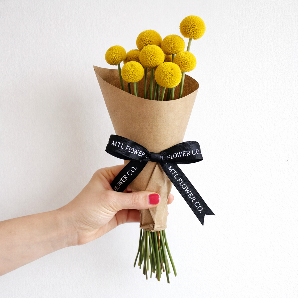 Also known as Billy Balls, these sculptural yellow blooms are loved for their perfectly round shape and long-lasting beauty. Each bunch includes 10 dried stems, carefully wrapped in kraft paper by our team at Mtl Flower Co. — perfect for styling in a small vase, adding to shelves, or brightening a workspace.